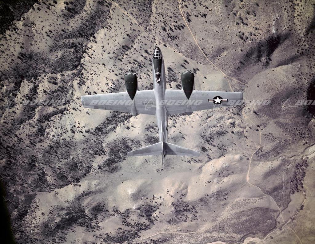 North American Aviation's straight-wing B-45 Tornado, designed during 1944 and 1945, first flew in February 1947. It was the first jet bomber in service with the Air Force and the first four-jet airplane to fly in the United States. Versions included the longer-range B-45C with wingtip tanks and the photoreconnaissance version, the RB-45C. Rated as a light bomber by modern-day standards, it was the first four-jet aircraft to drop an atom bomb and the first to be refueled in midair. It had a wingspan of 89 feet, and it was 75 feet 11 inches long.