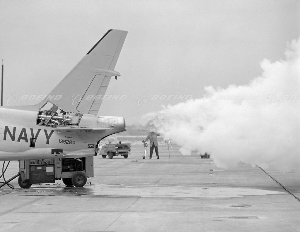The North American Aviation FJ-1 Fury, the first of a series of four Navy aircraft, was a single-engine, single-seat, low-wing monoplane with short stubby wings looking much like a high-flying bomb. With the air intake, engine and fuel tanks enclosed within the airplane, the fighter was given super-thin high speed laminar flow wings. The FJ-1 was the first American jet fighter to employ a single, straight ram duct with its entrance in the nose. Later versions, the -2, -3 and -4 models, were designed with swept wings for operation at higher altitudes and faster speed over a greater range than earlier Fury jets.