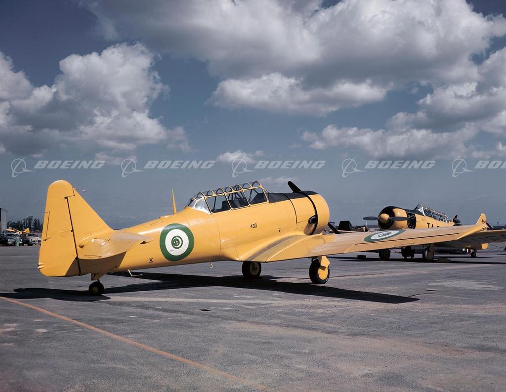 The T-6 Texan two-place advanced trainer was the classroom for most of the Allied pilots who flew in World War II. Called the SNJ by the Navy and the Harvard by the RAF, the T-6 was designed as a transition trainer between basic trainers and first-line tactical aircraft. In all, the T-6 trained several hundred thousand pilots in 34 different countries. A total of 15,495 of the planes were made. Though most famous as a trainer, the T-6 Texan also won honors in World War II and in the early days of the Korean War. The Texan was an evolution of the company's BC-1 basic combat trainer. It was designed by North American Aviation as a low-cost trainer with all the characteristics of a high-speed fighter. Although not as fast as a fighter, it was easy to maintain and repair, had more maneuverability and was easier to handle. A pilot's airplane, it could roll, Immelmann, loop, spin, snap, and vertical roll. It was designed to give the best possible training in all types of tactics, from ground strafing to bombardment and aerial dogfighting, and contained such versatile equipment as bomb racks, blind flying instrumentation, gun and standard cameras, fixed and flexible guns, and just about every other device that military pilots had to operate.