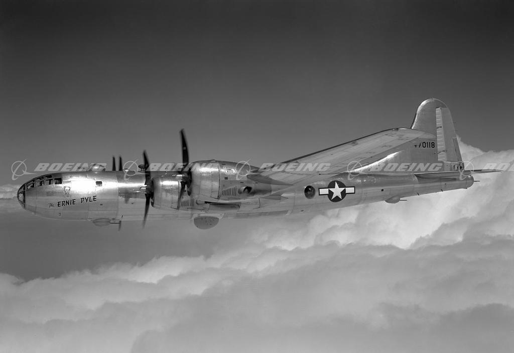 The Boeing B-29 Superfortress, the most technologically advanced airplane produced during World War II, first flew Sept. 21, 1942. The B-29 had many new features, including guns that could be fired by remote control. The crew areas were pressurized and connected by a long tube over the bomb bays. The tail gunner had a separate pressurized area that could only be left during unpressurized flight. At 105,000 pounds, the B-29 was also the heaviest production plane because of increases in range, bomb load and defensive requirements. The B-29 used the high-speed Boeing 117 airfoil, and its larger Fowler flaps added to the wing area as they increased lift. Modifications led to the B-29D, upgraded to the B-50, and the RB-29 photo reconnaissance aircraft. The Soviet-built copy of the B-29 was called the Tupolev Tu-4. A total of 3,970 B-29s were built.