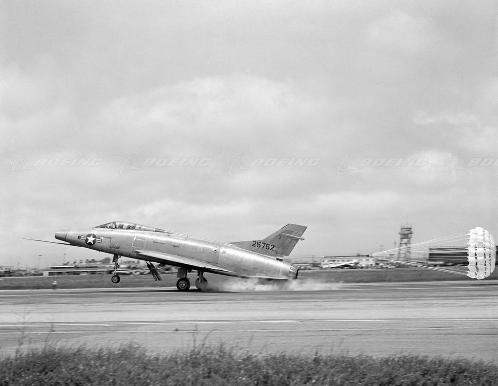 The F-100 Super Sabre was a sleek, swept-back-wing fighter that gave the United States a supersonic Air Force. Since May 1953, when the first prototype model, the YF-100, bettered the speed of sound on its first flight, the versatile fighter set numerous records for speed, endurance, range and maintenance. Late production models of the F-100D and F-100F had the capability of being launched from remote areas in the manner of manned missiles. Of the 2,290 Super Sabres produced, 1,274 F-100Ds included the first autopilot designed for a supersonic jet. Powered by a 16,950-pound-thrust afterburning jet engine, the F-100 was armed with four 20-millimeter cannons, two GAM 83A Bulldog missiles, four Sidewinder missiles, rockets, special stores, and/or 7,040 pounds of bombs.To demonstrate the ability of its pilot and aircraft, the Air Force chose F-100 Super Sabres to perform throughout the world in aerial precision demonstration flights. The famed Thunderbirds, a four-man aircraft team, were viewed by over 19 million people as the storied pilots performed intricate precision maneuvers at low altitude.