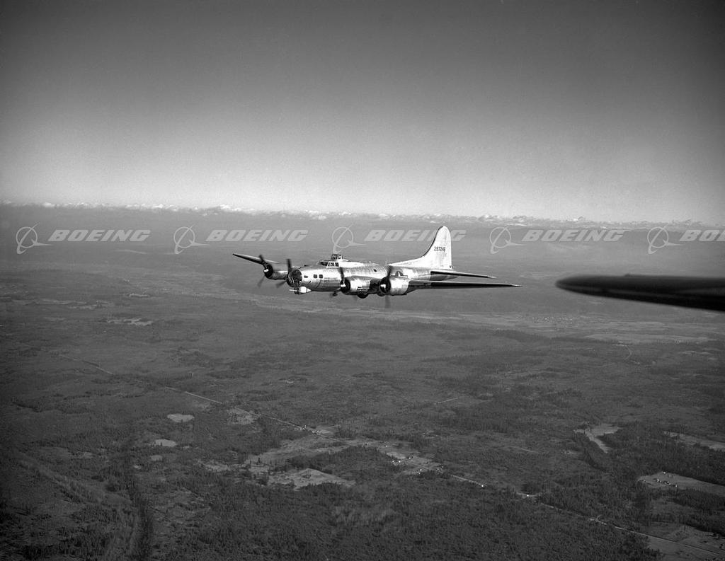 In response for the Army’s request for a large, multiengine bomber, the B-17 (Model 299) prototype, financed entirely by Boeing, went from design board to flight test in less than 12 months. The B-17 was a low-wing monoplane that combined aerodynamic features of the XB-17 giant bomber, still in the design stage, and the Model 247 transport. The B-17 was the first Boeing military aircraft with a flight deck instead of an open cockpit and was armed with bombs and five .30-caliber machine guns mounted in clear blisters. The B-17E, the first mass-produced model Flying Fortress, carried nine machine guns and a 4,000-pound bomb load. It was several tons heavier than the prototypes and bristled with armament. It was the first Boeing airplane with the distinctive - and enormous - tail for improved control and stability during high-altitude bombing. Each version was more heavily armed. In the Pacific, the planes earned a deadly reputation with the Japanese, who dubbed them four-engine fighters. The Fortresses were also legendary for their ability to stay in the air after taking brutal poundings. They sometimes limped back to their bases with large chunks of the fuselage shot off.