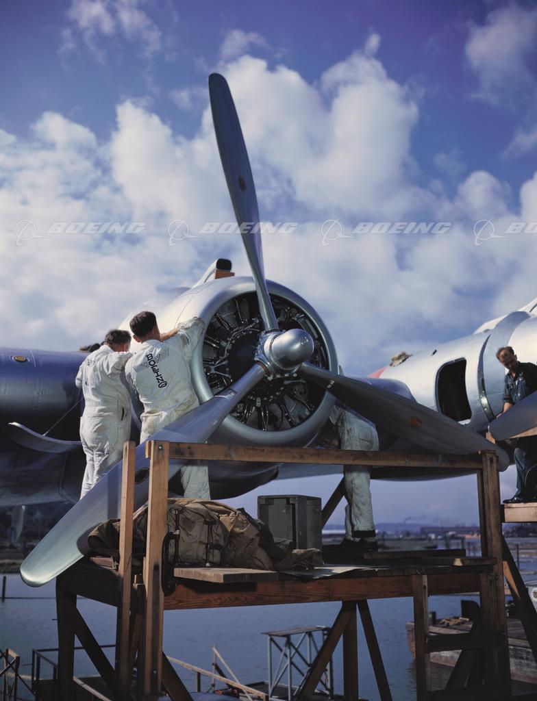 The whale-shaped Boeing Model 314 flying boat took cruise ship elegance into the air. Luxurious amenities aboard the Clipper included a stylish lounge, a dining salon, and a bridal suite. At 106 feet long with a 152-foot wingspan, it was the largest passenger transport in its time. At night, 74 seats converted into 40 bunks. It first flew in 1938 and on June 28, 1939, made the first scheduled transatlantic flight. In 1943, President Franklin Delano Roosevelt celebrated his birthday on a Model 314 airplane, flying to Casablanca and back, becoming the first U.S. president to fly while in office.