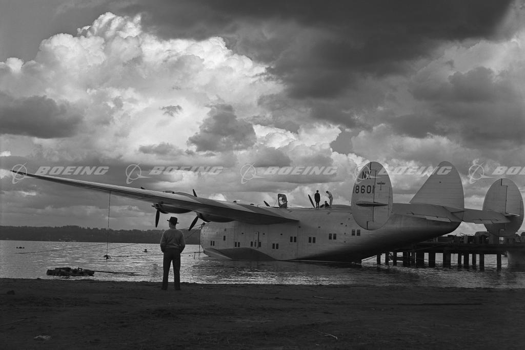 The whale-shaped Boeing Model 314 flying boat took cruise ship elegance into the air. Luxurious amenities aboard the Clipper included a stylish lounge, a dining salon, and a bridal suite. At 106 feet long with a 152-foot wingspan, it was the largest passenger transport in its time. At night, 74 seats converted into 40 bunks. It first flew in 1938 and on June 28, 1939, made the first scheduled transatlantic flight. In 1943, President Franklin Delano Roosevelt celebrated his birthday on a Model 314 airplane, flying to Casablanca and back, becoming the first U.S. president to fly while in office.