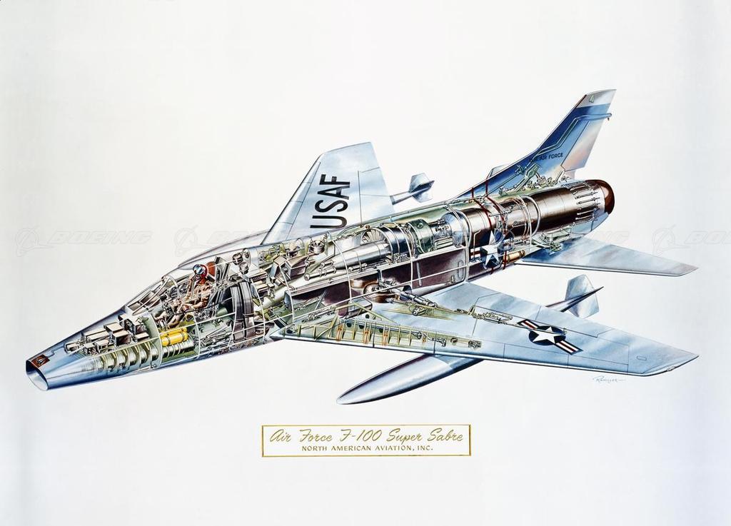 The F-100 Super Sabre was a sleek, swept-back-wing fighter that gave the United States a supersonic Air Force. Since May 1953, when the first prototype model, the YF-100, bettered the speed of sound on its first flight, the versatile fighter set numerous records for speed, endurance, range and maintenance. Late production models of the F-100D and F-100F had the capability of being launched from remote areas in the manner of manned missiles. Of the 2,290 Super Sabres produced, 1,274 F-100Ds included the first autopilot designed for a supersonic jet. Powered by a 16,950-pound-thrust afterburning jet engine, the F-100 was armed with four 20-millimeter cannons, two GAM 83A Bulldog missiles, four Sidewinder missiles, rockets, special stores, and/or 7,040 pounds of bombs.To demonstrate the ability of its pilot and aircraft, the Air Force chose F-100 Super Sabres to perform throughout the world in aerial precision demonstration flights. The famed Thunderbirds, a four-man aircraft team, were viewed by over 19 million people as the storied pilots performed intricate precision maneuvers at low altitude.