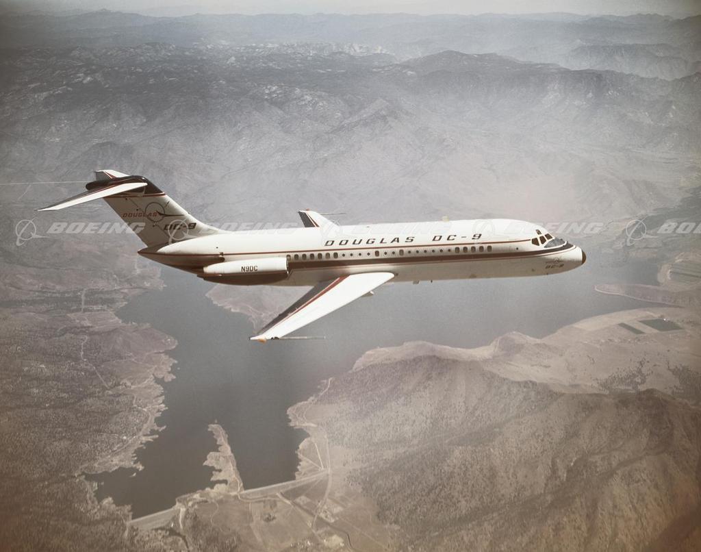 Douglas DC-9 (1965-1982): The DC-9 jetliner was designed to serve smaller airports and shorter routes than those served by the larger Boeing 727. It was developed to be a jet-age DC-3, bringing reliable jet service to any airport in the world. Smaller than the DC-8, the baseline DC-9 carried fewer passengers than some versions of the propeller driven DC-6 and DC-7 airliners. The DC-9 made its first flight on February 25, 1965, and entered service with Delta Airlines just 10 months later. It quickly became one of the most popular airlines ever built. In addition, the U.S. military ordered specially modified versions of the DC-9. The C-9A Nightingale was used by the Air Force to transport sick and injured military personnel. The Navy and Marine Corps flew the C-9B Skytrain II. Three executive transport versions were delivered to the Air Force as the VC-9C. With 976 aircraft produced in eight variations, the DC-9 ended its 17 year production run in 1982. Today, more than 800 DC-9s are still flying.