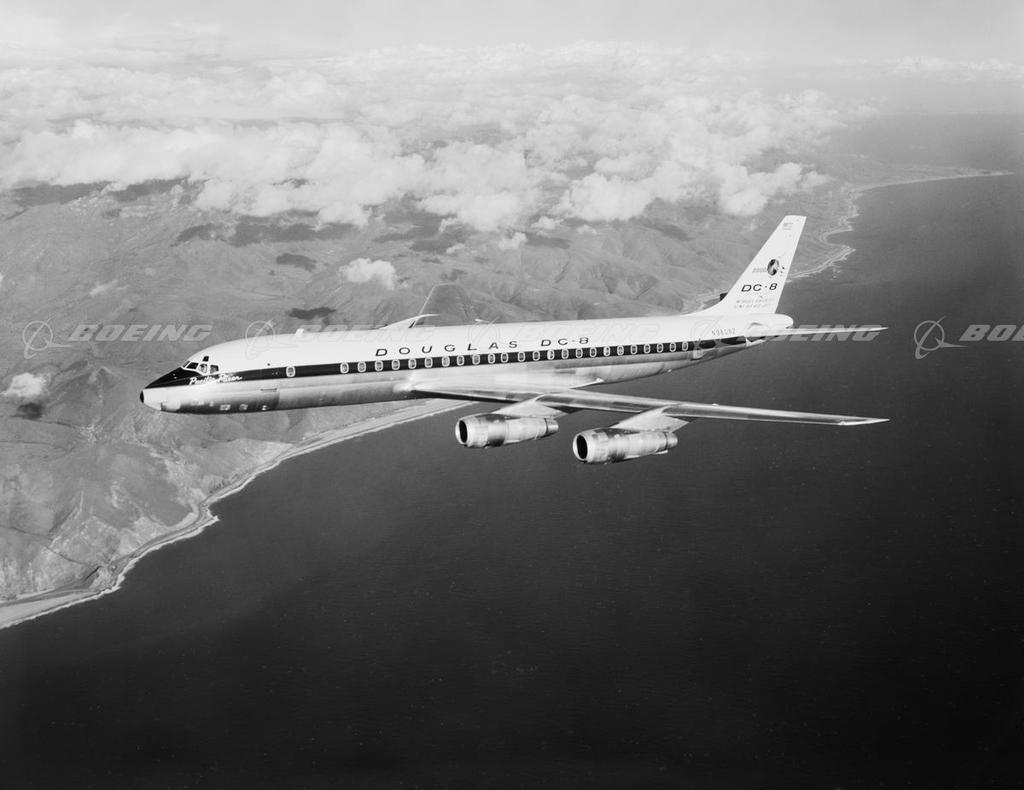 Douglas DC-8 (1958-1972): The Boeing 367-80 prototype jet transport had already made its first flight before Douglas decided to proceed with a jetliner of its own. The DC-8 was the first jet in the DC series and the first Douglas airliner to be completely built at the company’s plant in Long Beach, Ca. Powered by four turbofan jet engines and capable of speeds nearly 600 miles per hour, the DC-8 made its first flight on May 30, 1958. During a 14-year production run, the DC-8 went through seven major variants for a total of 556 aircraft. The plane set world records for speed, cargo capacity and range. During a test dive in 1962, a DC-8 Series 53 became the first commercial airliner to exceed the speed of sound. With a maximum capacity of 259 passengers, the DC-8 Super 63 was the largest commercial jet flying until the Boeing 747 entered service in 1970.