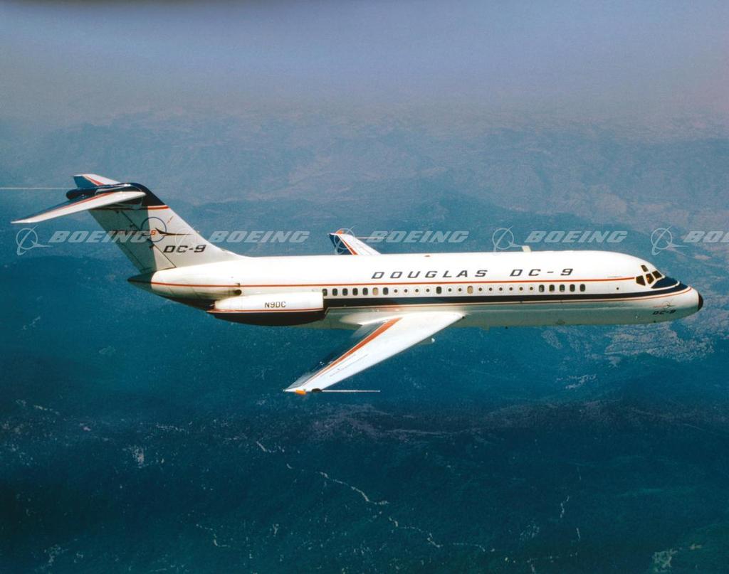 Douglas DC-9 (1965-1982): The DC-9 jetliner was designed to serve smaller airports and shorter routes than those served by the larger Boeing 727. It was developed to be a jet-age DC-3, bringing reliable jet service to any airport in the world. Smaller than the DC-8, the baseline DC-9 carried fewer passengers than some versions of the propeller driven DC-6 and DC-7 airliners. The DC-9 made its first flight on February 25, 1965, and entered service with Delta Airlines just 10 months later. It quickly became one of the most popular airlines ever built. In addition, the U.S. military ordered specially modified versions of the DC-9. The C-9A Nightingale was used by the Air Force to transport sick and injured military personnel. The Navy and Marine Corps flew the C-9B Skytrain II. Three executive transport versions were delivered to the Air Force as the VC-9C. With 976 aircraft produced in eight variations, the DC-9 ended its 17 year production run in 1982. Today, more than 800 DC-9s are still flying.
