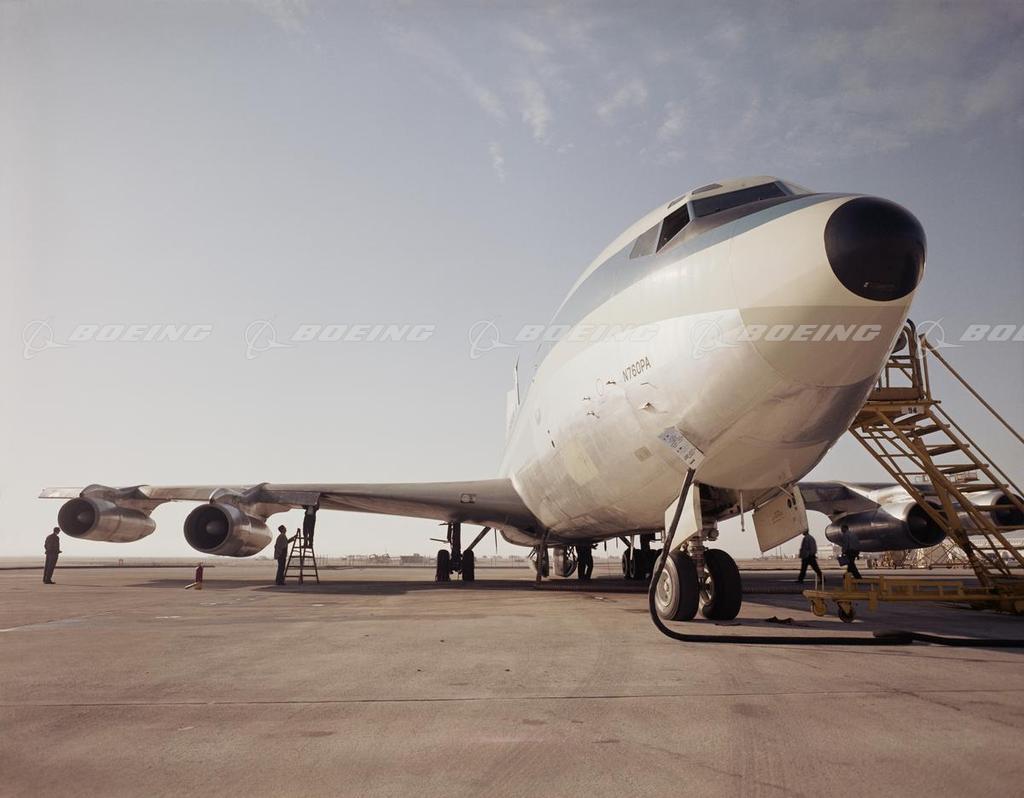 America entered the era of jet transportation on July 15, 1954, when the Boeing “Dash 80” prototype airplane for both the KC-135 military tanker and the Model 707 commercial jet transport made its maiden flight from Renton Field, south of Seattle, Wash. The 144-foot-long Model 707 jet followed the KC-135 Stratotanker into production. On Oct. 26, 1958, Pan American World Airways inaugurated transatlantic 707 jet service between New York and Paris. Boeing custom-designed the 707 jets to meet a variety of airline requirements, including the 9-foot-shorter 720 jet for short to medium routes. The long-range 707-320 intercontinental transport was most ordered and also was modified as the first “Air Force One” presidential aircraft, as well as for the E-3 Airborne Warning and Control System (AWACS) and the E-6 submarine communications system.