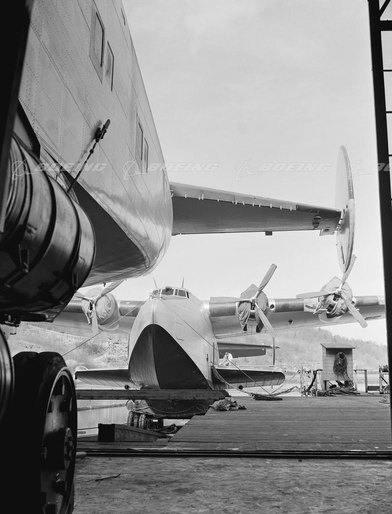 The whale-shaped Boeing Model 314 flying boat was the largest passenger transport of its time, and it took cruise ship elegance into the air. Luxurious amenities aboard the Clipper included a stylish lounge, a dining salon, and a bridal suite. At 106 feet long with a 152-foot wingspan, it was the largest passenger transport in its time. At night, 74 seats converted into 40 bunks. It first flew in 1938 and on June 28, 1939, made the first scheduled transatlantic flight. In 1943, President Franklin Delano Roosevelt celebrated his birthday on a Model 314, flying to Casablanca and back, becoming the first U.S. president to fly while in office.