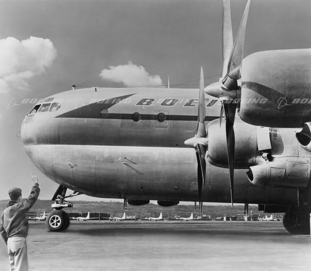The 377 Stratocruiser was the last of the Boeing propeller-powered luxury airliners. Known as the “First Lady of the Airways,” it first flew in 1947 as the elegant, civilian offspring of the C-97, a military freighter that carried soldiers and equipment during World War II. A circular stairway led from the cabin to a lower deck luxury lounge. As a sleeper, it held 28 upper- and lower-bunk units. The first Stratocruiser began service in 1949 between San Francisco to Honolulu. Only five years later, the Boeing “Dash 80” prototype for the Model 707 made its first flight, and the Stratocruiser became obsolete. It found a new career as special transport for large sections of spacecraft. With its fuselage swollen by a superstructure, the once-elegant Stratocruiser became known as the “Pregnant Guppy” and, even larger, as the “Super Guppy.”