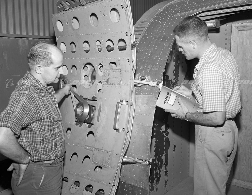 After the Air Force agreed to let Boeing build commercial jets based on the prototype 367-80, already the basis for the KC-135 military tanker, airlines began to order the 707, the commercial transport variant of the Dash 80. The 707 and the KC-135 had many features in common. Both were visually distinct, with a stinger antenna pointing forward from the top of their vertical fin. The 707's width and 100-foot length made it the largest passenger cabin in the air at the time. Placement of its more than 100 windows allowed airlines to rearrange seats. Location of passenger doors on the left side, at the front and at the rear of the cabin, became standard for subsequent Boeing jets. The exteriors of the 707 and its competitor, the DC-8, were almost identical, but the 707 wing had more sweepback, so it could fly about 20 mph faster.