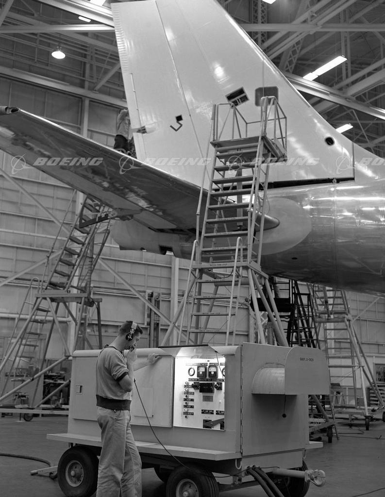 After the Air Force agreed to let Boeing build commercial jets based on the prototype 367-80, already the basis for the KC-135 military tanker, airlines began to order the 707, the commercial transport variant of the Dash 80. The 707 and the KC-135 had many features in common. Both were visually distinct, with a stinger antenna pointing forward from the top of their vertical fin. The 707's width and 100-foot length made it the largest passenger cabin in the air at the time. Placement of its more than 100 windows allowed airlines to rearrange seats. Location of passenger doors on the left side, at the front and at the rear of the cabin, became standard for subsequent Boeing jets. The exteriors of the 707 and its competitor, the DC-8, were almost identical, but the 707 wing had more sweepback, so it could fly about 20 mph faster.