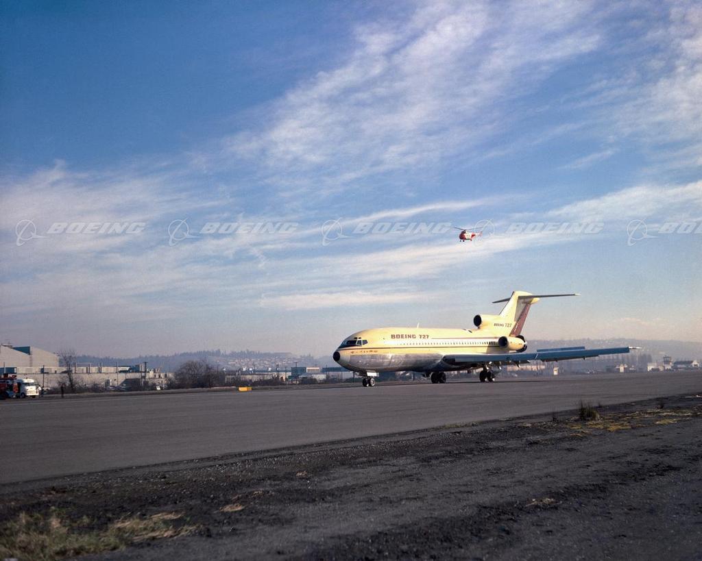 The short-to-medium-range 727 jet, which first flew in 1963, was the only Boeing-built trijet in its time. It was designed to operate out of small airports with shorter runways. The 131-passenger trijet also was the first Boeing commercial jetliner to use an auxiliary power unit (APU). The 727 jet also was built as a freighter and as a ''quick change'' version, which airlines could convert from a passenger transport to a freighter, or a combination of both, as they chose.