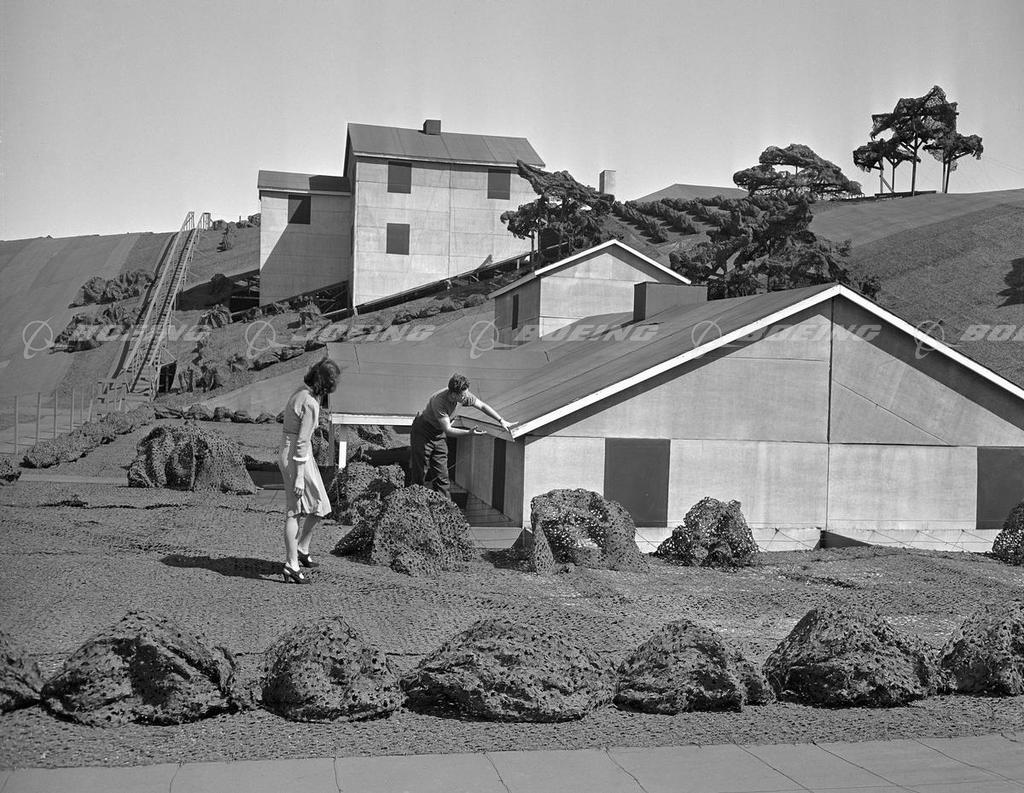 Camouflage installations and materials on Boeing Field and Plant II during WWII included bomb shelters, machine gun platforms, troop dormitories, a casualty station and a message center. The most elaborate camouflage construction was the 26-acre illusory residential Wonderland atop the Plant II factory building shown here. Made of chicken-feather trees, painted canvas buildings, green burlap lawns landscaped with shrubs of spun glass on wire, the "village" had 53 residences, 24 garages, a corner service station, a neighborhood store and three green houses. The wartime cover for the plant extended over neighboring Boeing Field. The camouflage over Boeing Field sported the look of a more sparsely settled community. In 1946 the camouflage structures were dismantled by Army engineers.