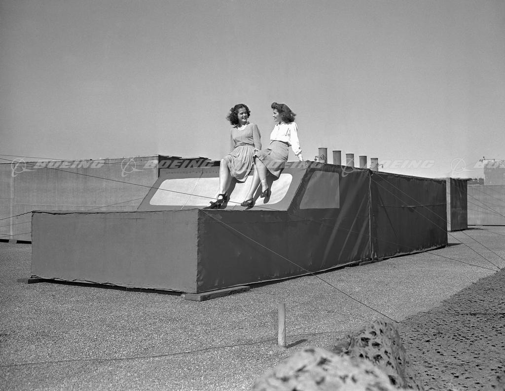 Camouflage installations and materials on Boeing Field and Plant II during WWII included bomb shelters, machine gun platforms, troop dormitories, a casualty station and a message center. The most elaborate camouflage construction was the 26-acre illusory residential Wonderland atop the Plant II factory building shown here. Made of chicken-feather trees, painted canvas buildings, green burlap lawns landscaped with shrubs of spun glass on wire, the "village" had 53 residences, 24 garages, a corner service station, a neighborhood store and three green houses. The wartime cover for the plant extended over neighboring Boeing Field. The camouflage over Boeing Field sported the look of a more sparsely settled community. In 1946 the camouflage structures were dismantled by Army engineers.