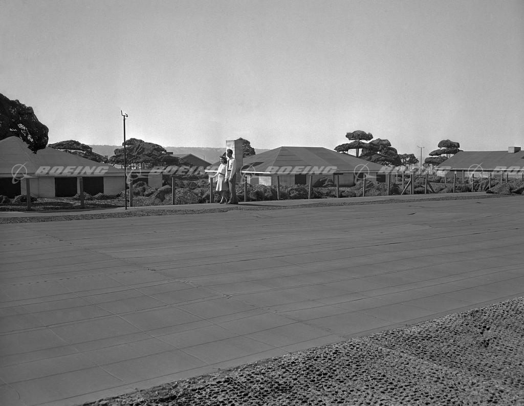 Camouflage installations and materials on Boeing Field and Plant II during WWII included bomb shelters, machine gun platforms, troop dormitories, a casualty station and a message center. The most elaborate camouflage construction was the 26-acre illusory residential Wonderland atop the Plant II factory building shown here. Made of chicken-feather trees, painted canvas buildings, green burlap lawns landscaped with shrubs of spun glass on wire, the "village" had 53 residences, 24 garages, a corner service station, a neighborhood store and three green houses. The wartime cover for the plant extended over neighboring Boeing Field. The camouflage over Boeing Field sported the look of a more sparsely settled community. In 1946 the camouflage structures were dismantled by Army engineers.