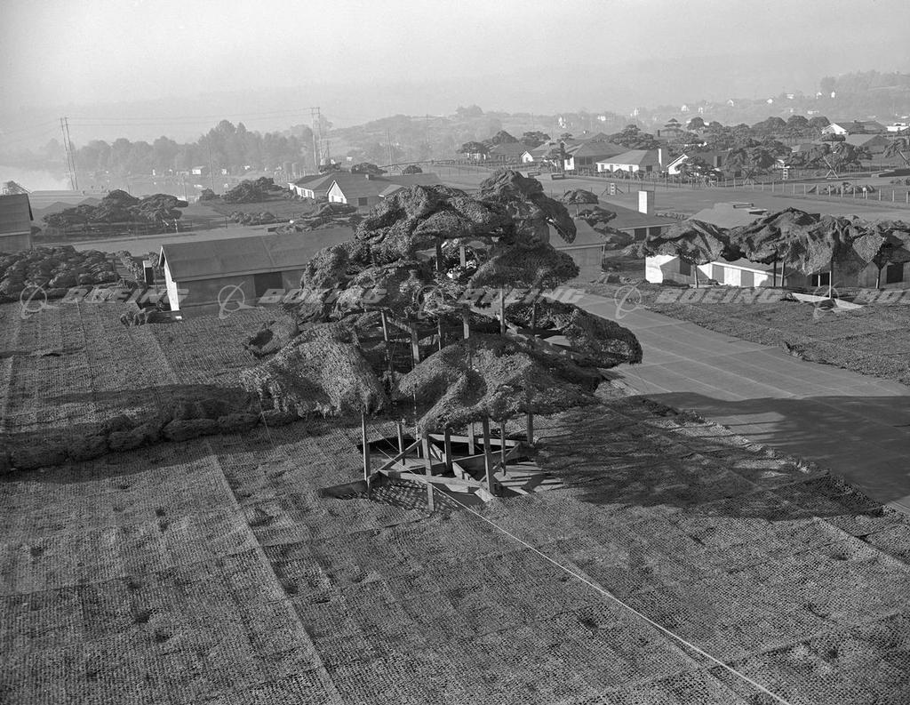 During WWII, a 26-acre make-believe village was constructed on top of Boeing's Plant II in Seattle to provide a wartime cover for the facility. Cottages were made of painted canvas, trees were constructed of wire mesh and wood covered with chicken feathers, and the lawn was actually green burlap. Construction of the Wonderland facility atop Plant II required one million board feet of lumber and one and one half million square feet of chicken wire. There were 500,000 feet of support wires and 500 tons of steel structures to support higher elevations. The camouflage extended beyond Plant II to neighboring Boeing Field, albeit in a more sparsely decorated fashion. When the illusory scene was dismantled by Army engineers in 1946, it was necessary to remove 42,000 square yards of dummy streets, 10,000 square yards of concrete dummy houses and walks, 85,000 yards of camouflage texturing from runways, paint from four buildings and blackout paint from one hangar.