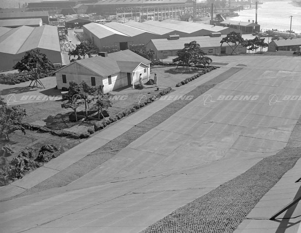 Camouflage installations and materials on Boeing Field and Plant II during WWII included bomb shelters, machine gun platforms, troop dormitories, a casualty station and a message center. The most elaborate camouflage construction was the 26-acre illusory residential Wonderland atop the Plant II factory building shown here. Made of chicken-feather trees, painted canvas buildings, green burlap lawns landscaped with shrubs of spun glass on wire, the "village" had 53 residences, 24 garages, a corner service station, a neighborhood store and three green houses. The wartime cover for the plant extended over neighboring Boeing Field. The camouflage over Boeing Field sported the look of a more sparsely settled community. In 1946 the camouflage structures were dismantled by Army engineers.