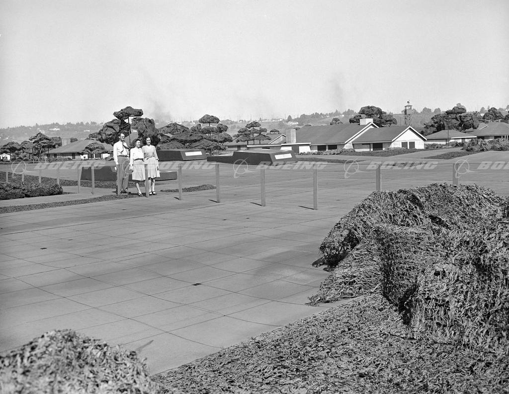 Camouflage installations and materials on Boeing Field and Plant II during WWII included bomb shelters, machine gun platforms, troop dormitories, a casualty station and a message center. The most elaborate camouflage construction was the 26-acre illusory residential Wonderland atop the Plant II factory building shown here. Made of chicken-feather trees, painted canvas buildings, green burlap lawns landscaped with shrubs of spun glass on wire, the "village" had 53 residences, 24 garages, a corner service station, a neighborhood store and three green houses. The wartime cover for the plant extended over neighboring Boeing Field. The camouflage over Boeing Field sported the look of a more sparsely settled community. In 1946 the camouflage structures were dismantled by Army engineers.