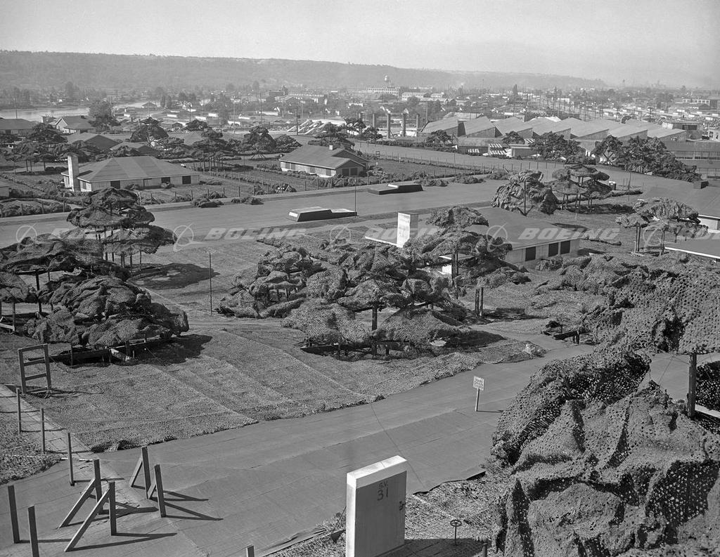 After the start of World War II, burlap houses and chicken-wire lawns camouflaged the rooftops of Boeing Plant 2 in Seattle so that, from the air, the bomber manufacturing center looked like a quiet suburb.