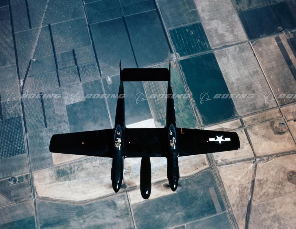 The North American P-82 Twin Mustang was the climactic development of a long series of the famous World War II P-51 Mustang series. North American produced 250 of the double-fuselaged airplanes for the Air Force, embracing three versions of the Twin Mustang then in service, the P-82E, P-82F, and P-82G. The versatility of the P-82 made it potentially adaptable to a wide variety of roles in modern aerial warfare. It could have been used as a fighter, a long-range escort, long-range reconnaissance, night fighter, attack bomber, rocket fighter or an interceptor. With a speed of more than 475 miles an hour, the Twin Mustang had a combat range of over 1,600 miles with full armament. Range could be extended by use of external drop tanks on the wings. A radical departure from the conventional single-fuselage airplane, the Twin Mustang was formed by two fuselages joined by the wing and the horizontal stabilizer. With a pilot in each fuselage, it reduced the problem of pilot fatigue on ultra-long-range missions. The P-82F and G models carried a radar operator in the right cockpit instead of a co-pilot.