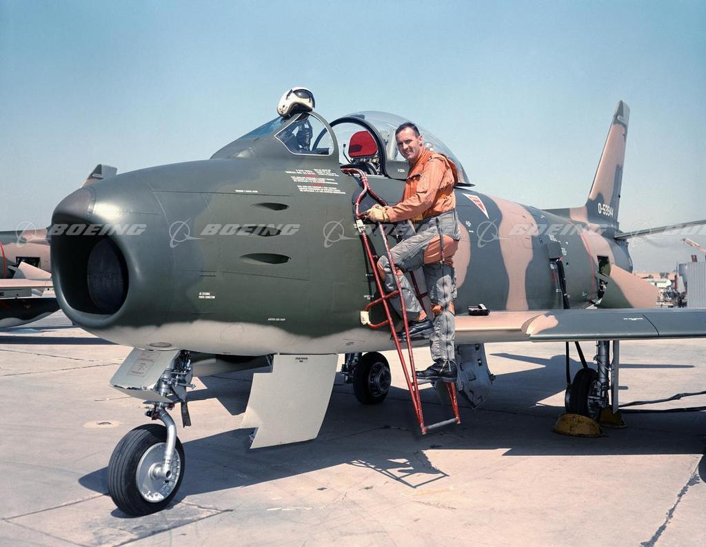 The North American F-86 Sabre Jet made its first flight Oct. 1, 1947, and was America’s first single-seat, swept-wing jet fighter. In 1948, it set a new world speed record of 671 mph, and it was the world’s first-line fighter for more than a decade after it was designed. More than 6,000 Sabre Jets were built worldwide. During the Korean conflict, the Sabre Jet flew 82,177 sorties during 32 months of combat and troop support. The version built for the U.S. Navy and Marine Corps was called the FJ-2 Fury.