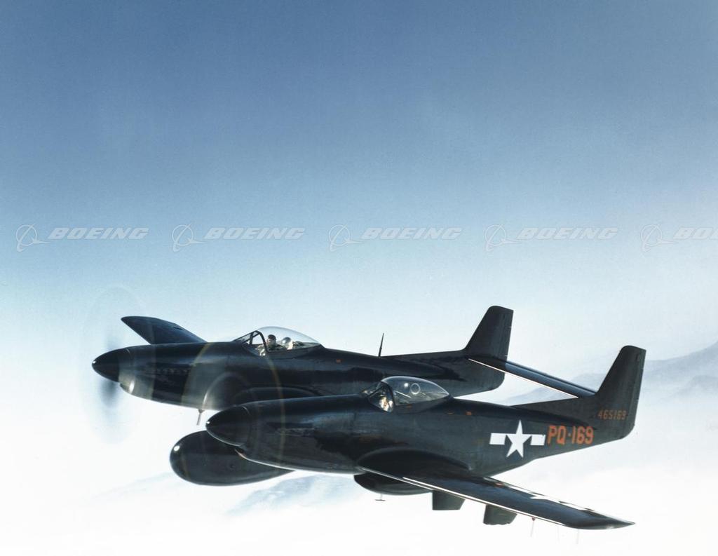 The North American P-82 Twin Mustang was the climactic development of a long series of the famous World War II P-51 Mustang series. North American produced 250 of the double-fuselaged airplanes for the Air Force, embracing three versions of the Twin Mustang then in service, the P-82E, P-82F, and P-82G. The versatility of the P-82 made it potentially adaptable to a wide variety of roles in modern aerial warfare. It could have been used as a fighter, a long-range escort, long-range reconnaissance, night fighter, attack bomber, rocket fighter or an interceptor. With a speed of more than 475 miles an hour, the Twin Mustang had a combat range of over 1,600 miles with full armament. Range could be extended by use of external drop tanks on the wings. A radical departure from the conventional single-fuselage airplane, the Twin Mustang was formed by two fuselages joined by the wing and the horizontal stabilizer. With a pilot in each fuselage, it reduced the problem of pilot fatigue on ultra-long-range missions. The P-82F and G models carried a radar operator in the right cockpit instead of a co-pilot.