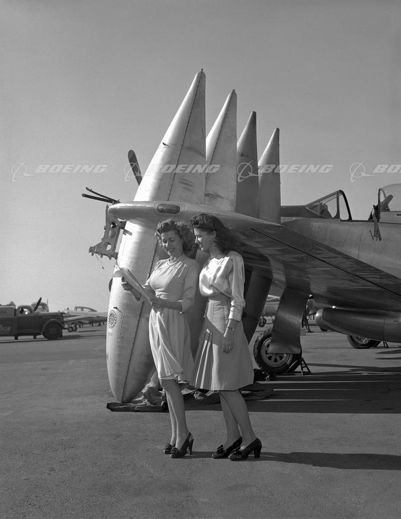 Women Chatting in Front of P-82 Twin Mustang with Drop Tanks