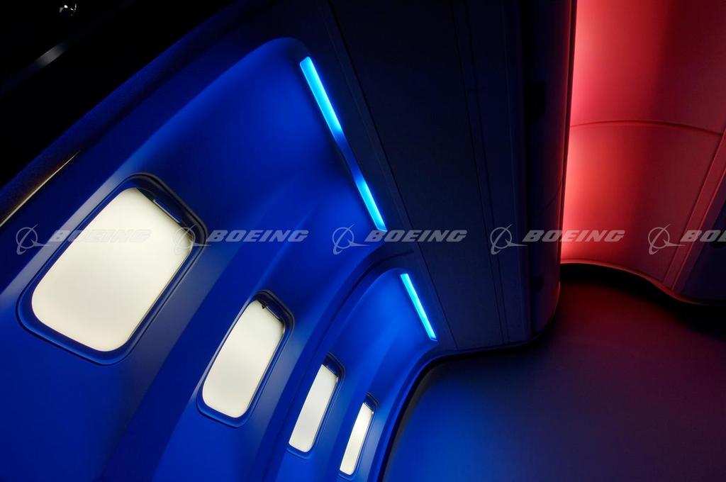 A highlight inside the Customer Experience Center in Renton, WA is the interior arch of a Boeing 767 that projects enhanced interior retrofits. The 767 Enhanced Interior has a similar look and feel to the 767-400, featuring new ceiling panels, centerline bins, and new outboard bin doors.