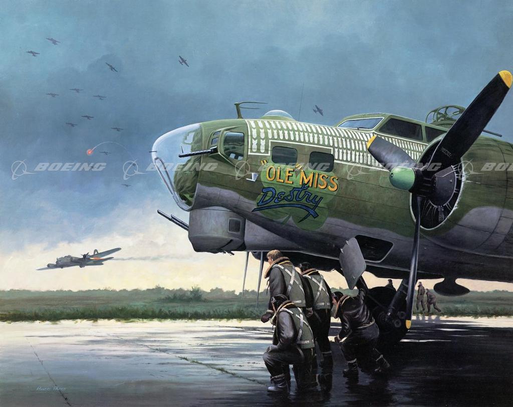 The crew of the "Ole" Miss Destry watches a crippled B-17 land at Chelveston, England. The damaged B-17 has fired a flare indicating she has wounded onboard, and the aircraft itself has two engines shot out, one on fire, and only one landing gear down.