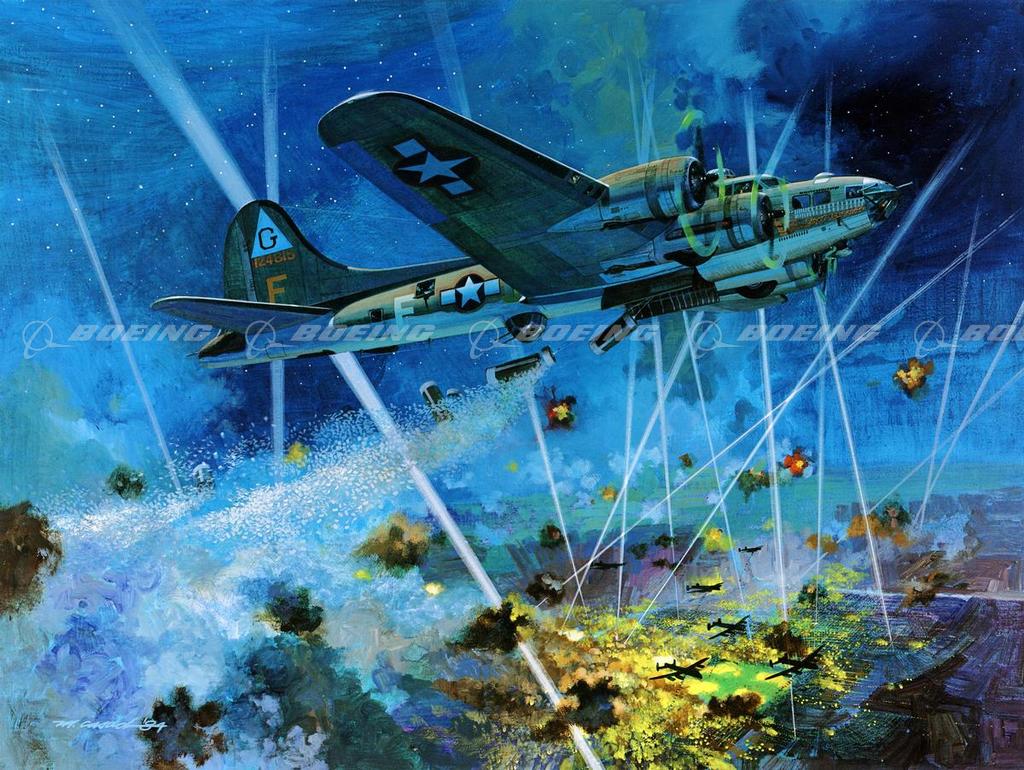 The heavily armored B-17F was distinguished by its molded plexiglass nose assembly and wide paddle-blade propellers. It could fly farther than previous B-17s because of the 1,000 gallons of additional fuel stored in self-sealing tanks. Under the Boeing-Douglas-Vega nationwide, collaborative production effort, Boeing built 2,300 B-17Fs, Douglas 600; and Lockheed (Vega), 500.