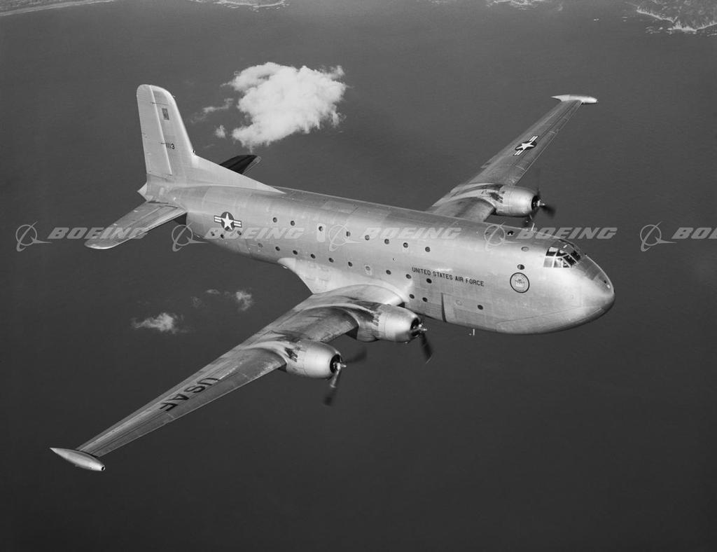 Douglas C-124 Globemaster II (1949-1955): The C-124 Globemaster II was an improved version of the 1945 Douglas C-74 Globemaster. The C-124 featured a gigantic fuselage, with clamshell doors under the plane's nose that allowed dive-in access to a cargo compartment almost 12 feet high. It made its first flight on November 27, 1949 from the Douglas plant at Long Beach, Ca. Its delivery to the U.S. Air Force coincided with the onset of the Korean War and the C-124 played an important role in the airlift of supplies to the Far East. The C-124 could carry more cargo, longer distances than any other military transport of the time. It could accommodate 200 troops, or 123 stretchers, or up to 74,000 pounds of cargo. The last of 448 C-124 Globemaster IIs were delivered to the Air Force in 1955, but the big plane's dependability allowed it to remain in service until 1978.