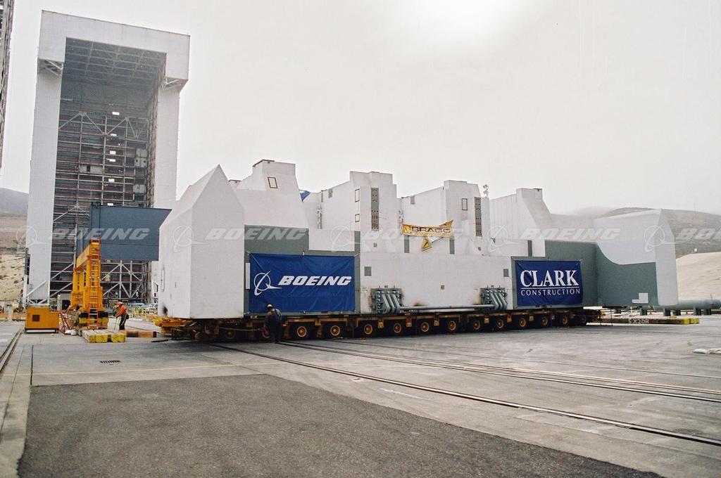 The 650-ton steel launch table for the Boeing Delta IV launch pad arrives at Space Complex 6, Vandenberg Air Force Base, CA, on Oct. 18, 2001. The Delta IV is the most advanced family of rockets developed by The Boeing Company in partnership with the U.S. Air Force Evolved Expendable Launch Vehicle program to provide Assured Access to Space for U.S. government customers. Delta IV rockets can accommodate single or multiple payloads on the same mission and can launch payloads to polar orbits, Sun-synchronous orbits, geosynchronous and geosynchronous transfer orbits, and low-Earth orbit.