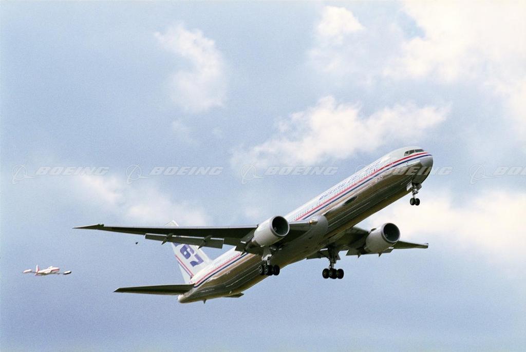 The 767-400ER (extended range) rose into the sky above Paine Field in Everett, Wash., on Oct. 9, 1999 for the first time, and headed west down the Strait of Juan de Fuca. The airplane, identified as VQ001, lifted off the runway at 12:10 p.m. During the flight a series of tests were conducted on the airplane's systems and structures. Flight-test equipment on board recorded and transmitted data to a flight-test control room at Boeing Field in Seattle. The debut flight signalled the official beginning of a six-and-a-half-month flight-test program for the 767-400ER, during which this airplane, and two other 767-400ERs accumulated approximately 800 flight hours and 1,100 ground-test hours. At the conclusion of flight tests, the 767-400ER achieved certification by the U.S. Federal Aviation Administration and concurrence by the European Joint Aviation Authorities.