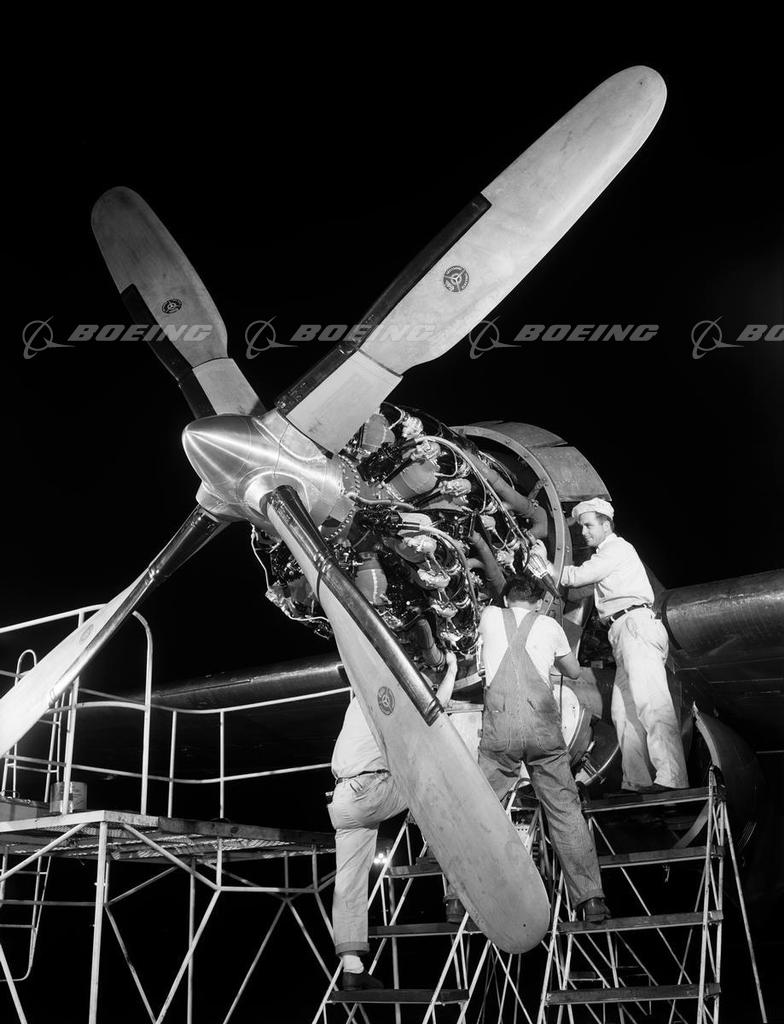 Mechanics work on an engine from a 377 Stratocruiser, providing a good view of its variable pitch propeller.