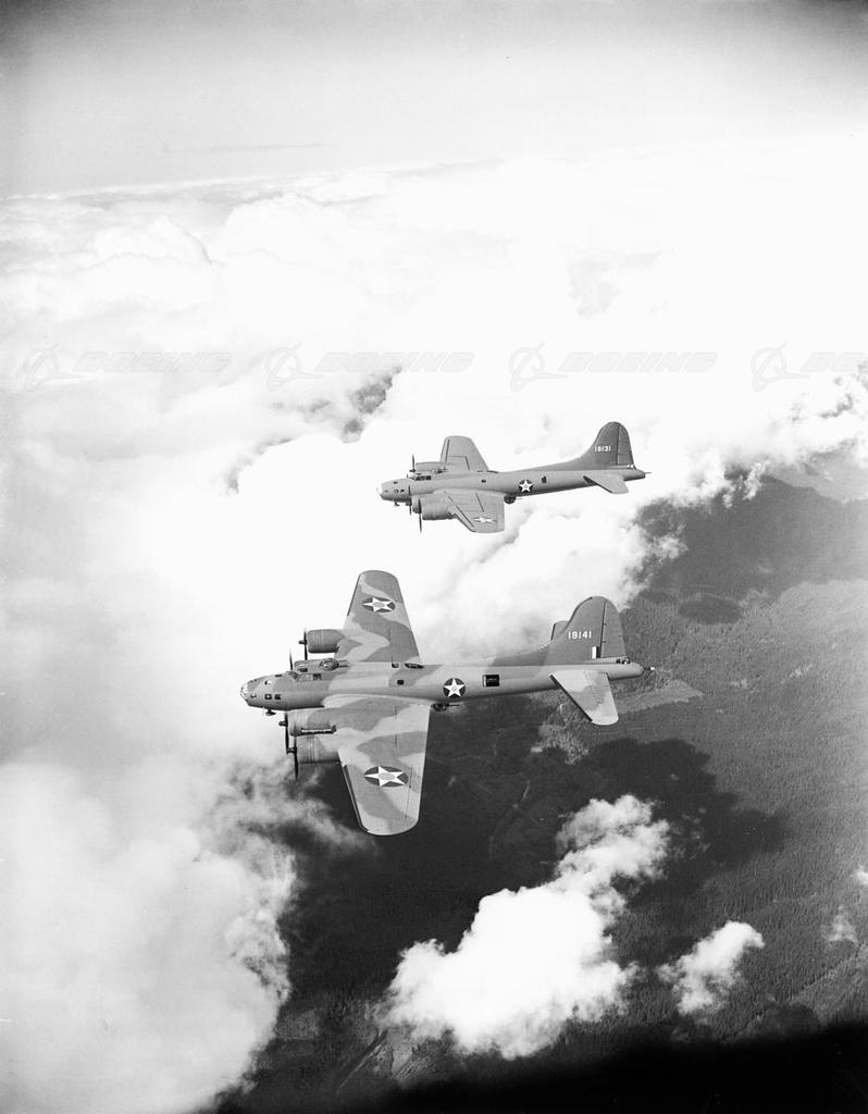 Two B-17E Flying Fortresses from the 97th Bombing Group in flight in 1942. The US Army re-acquired several B-17Es that were built for the Royal Air Force. The near aircraft still sports the camouflage markings of RAF aircraft.