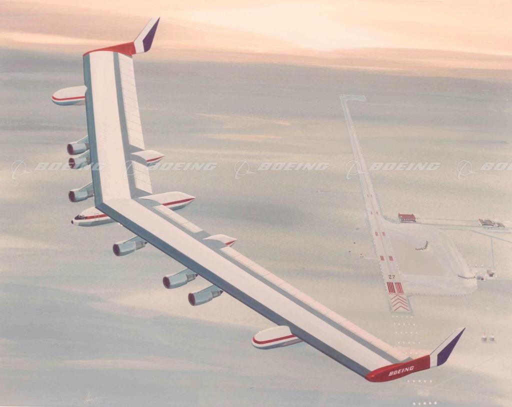 In the 1970s, Boeing studied the concept of a "distributed load freighter," a six-engined giant designed to carry containerized freight at a much lower cost per pound then was possible at the time. In the concept pictured here, the payload would be carried in two pods, one on each wing, each 26 feet in diameter and 150 feet long. The pods could be removed and replaced, whether empty or full, within minutes, and could be used to carry almost anything. Because of its landing gear width, it would operate only from airfields dedicated to air freight.