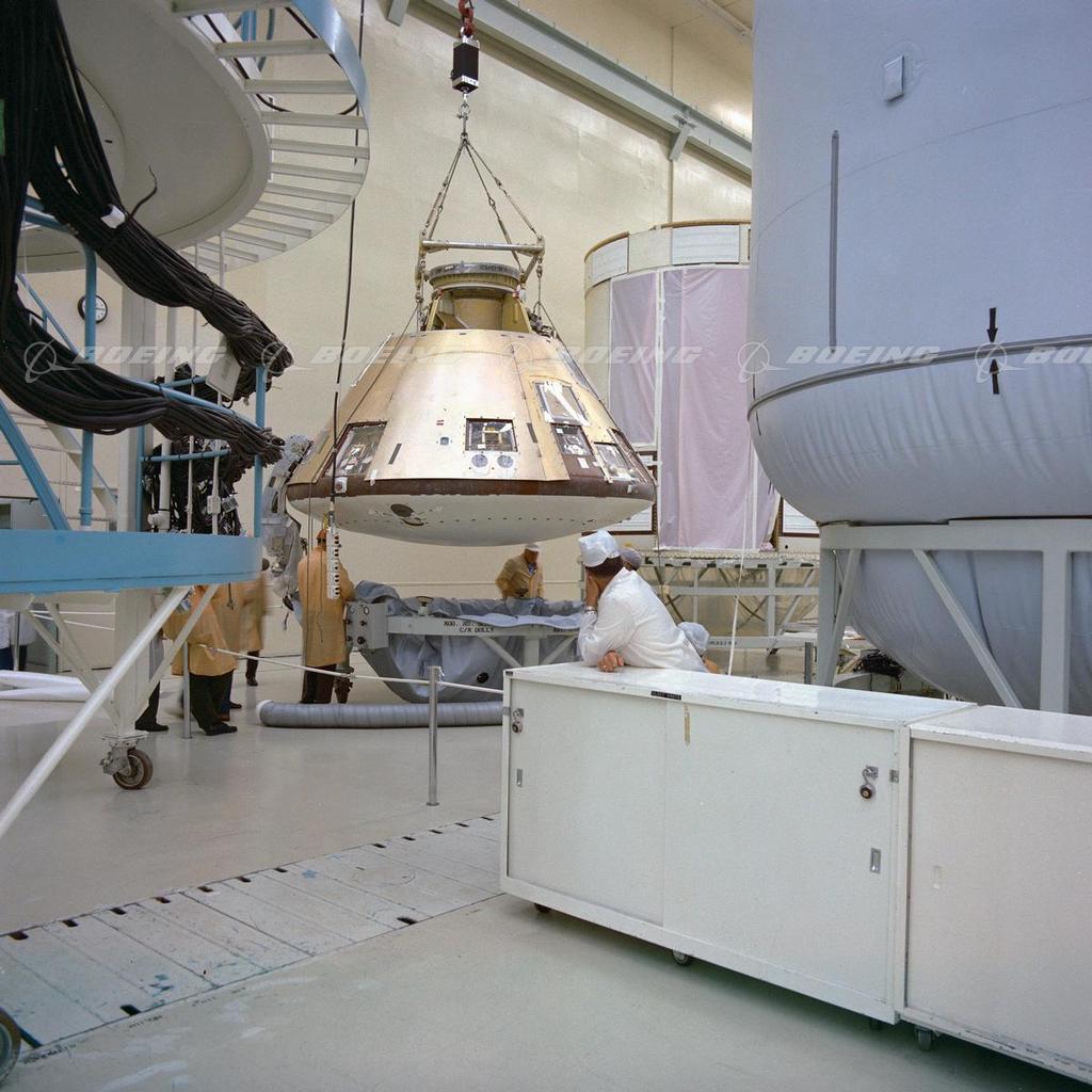 All the major sections of the Apollo spacecraft and launch vehicle, with the exception of the Grumman-built Lunar Module, were developed and built by companies that would later join to form 21st century Boeing. These companies had a common customer, NASA, which led the U.S. effort to put a man on the Moon and return him safely to Earth. The Apollo command and service modules were built at North American Aviation's plant at Downey, California.