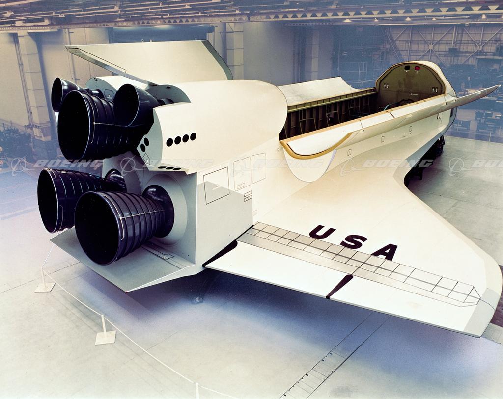A full scale mockup of the Space Shuttle orbiter on static display at Rockwell International Corporation's Space Division in Downey, California. The mockup's payload bay doors are open, showing huge 15 feet diameter, 60 feet long bay in which up to 29,484 kilograms (65,000 lbs.) of varied cargo will be carried to Earth orbit. Engine bells are replicas of those that will be used with orbiter's three 2.092 million newton (470,000 lb.) thrust engines being developed for NASA's Marshall Space Flight Center by Rockwell's Rocketdyne Division. Space Division is developing orbiter and integrating Space Shuttle system under contract to NASA's Lyndon B. Johnson Space Center.