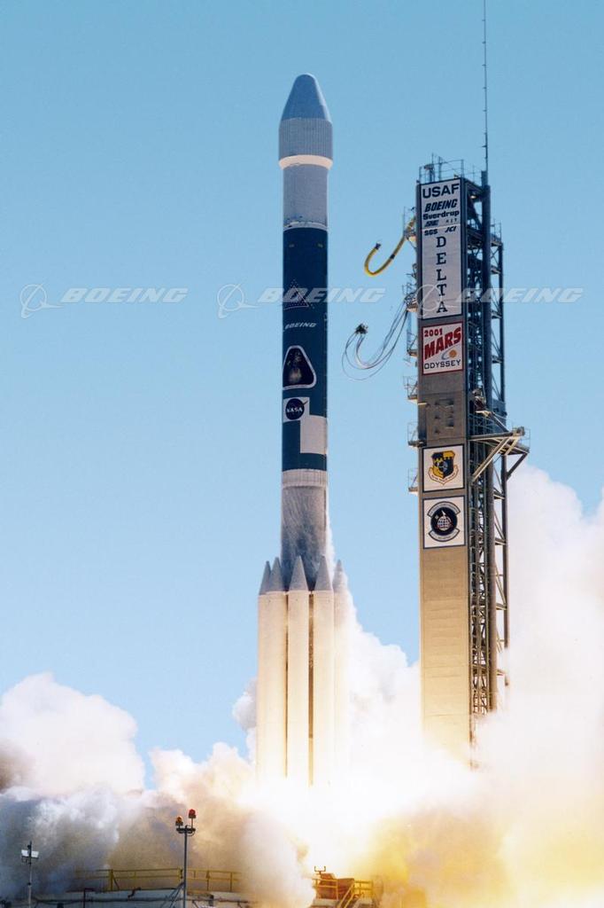 April 07, 2001 -- A Boeing Delta II rocket roared into the sky on April 7, 2007, sending NASA's Mars Odyssey spacecraft to the red planet. Liftoff from Cape Canaveral Space Launch Complex 17A occurred at 11:02 a.m. EDT. The mission is a continuation of NASA's exploration of Mars. Due to planetary alignment, this is the first opportunity to go to Mars since January 1999. Thirty-one minutes after the launch, at an altitude of 850 nautical miles, the spacecraft separated from the Delta II third stage and began its six-month journey to Mars.