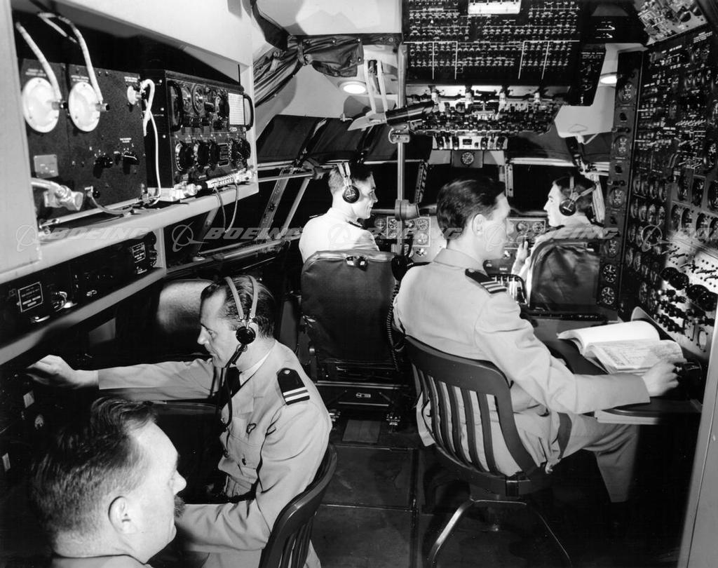 The crew in the 377 Stratocruiser's control cabin had more space than they were used to. Boeing designers arranged seating, controls, equipment, and groups of instruments to make it easier for crew members to work together and give them freedom of movement and excellent visibility.