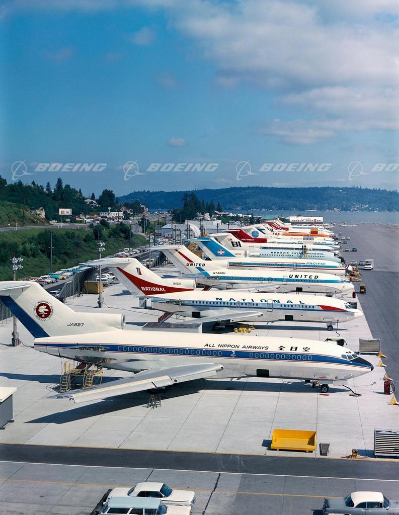 The first 727 rolled out Nov. 27, 1962, bearing the same lemon-yellow and copper-brown color scheme as the Dash 80. To help spur sales, Boeing sent a 727 on a 76,000-mile tour of 26 countries. Originally, Boeing planned to build 250 of the planes. However, after being shown to the world, they proved so popular (especially after the larger 727-200 model, which carried up to 189 passengers, was introduced) that a total of 1,832 were produced at the Renton plant. The 727 was the only Boeing-built trijet in its time. It was designed to operate out of small airports with shorter runways than were used by 707s. The 131-passenger trijet also was the first Boeing commercial jetliner to use an auxiliary power unit (APU), a small gas turbine that eliminated the need for ground power or starting equipment at small airports when the main engines were shut off. All 727s carried self-contained, hydraulically operated stairs, which, combined with the APU, could make the airplane independent of ground equipment. The 727 jet also was built as a freighter and as a ''quick change'' version, which airlines could convert from a passenger transport to a freighter, or a combination of both, as they chose.