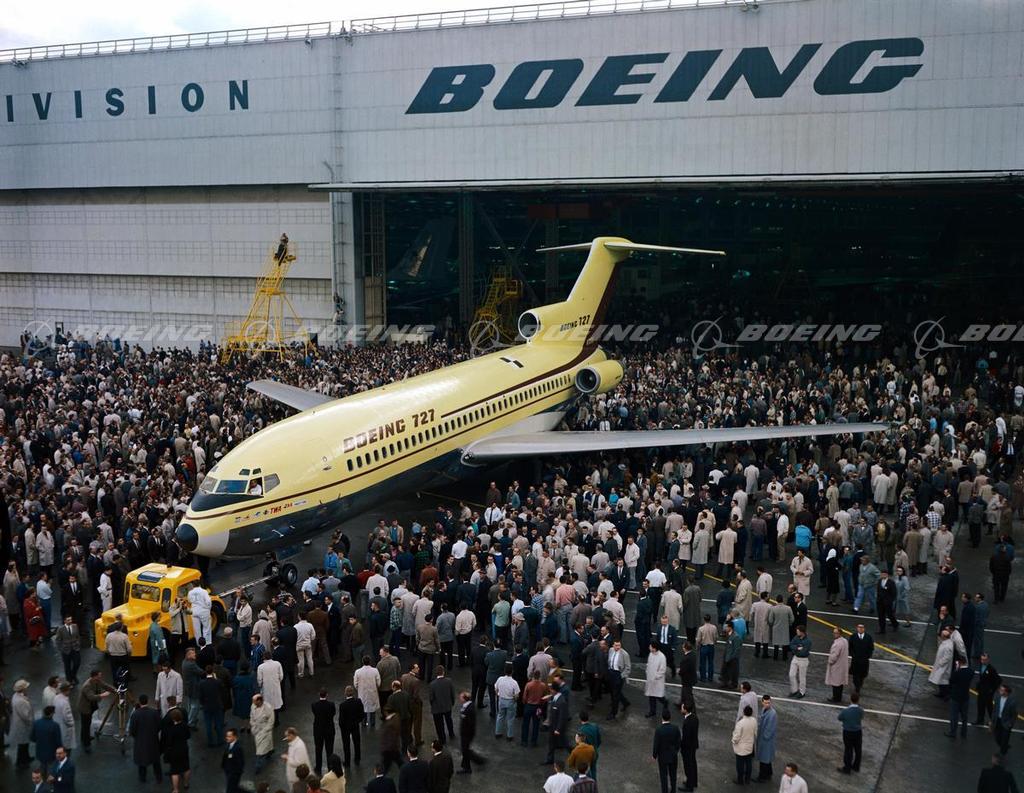 The first 727 rolled out Nov. 27, 1962, bearing the same lemon-yellow and copper-brown color scheme as the Dash 80. To help spur sales, Boeing sent a 727 on a 76,000-mile tour of 26 countries. Originally, Boeing planned to build 250 of the planes. However, after being shown to the world, they proved so popular (especially after the larger 727-200 model, which carried up to 189 passengers, was introduced) that a total of 1,832 were produced at the Renton plant. The 727 was the only Boeing-built trijet in its time. It was designed to operate out of small airports with shorter runways than were used by 707s. The 131-passenger trijet also was the first Boeing commercial jetliner to use an auxiliary power unit (APU), a small gas turbine that eliminated the need for ground power or starting equipment at small airports when the main engines were shut off. All 727s carried self-contained, hydraulically operated stairs, which, combined with the APU, could make the airplane independent of ground equipment. The 727 jet also was built as a freighter and as a ''quick change'' version, which airlines could convert from a passenger transport to a freighter, or a combination of both, as they chose.