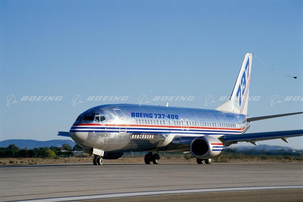Development of the quieter, more fuel-efficient CFM56-3 series of engines allowed Boeing to improve its most popular jetliners and produce the advanced-technology 737-330, -400, and -500. The engines are larger and mounted forward of the wing struts instead of tucked directly under the wing as in the -100 and -200 versions. Advancements on the new-generation 737s included a stregthened wing to accomodate greater gross weight, tip extensions to the wings and horizontal stabilizers, and stregthened wheels, tires and brakes. The 737-200, -300, -400, -500 have the same handling characteristics so that pilots can use the same Type rating to fly all of them. Airlines' spares inventory and maintenance are simplified by making a substantial number of replaceable parts on the -300, -400, -500 identical to those used on the -200. The 737-400 is about 10 feet longer than the 737-300. It holds 19 more passengers and has a gross weight of up to 150,000 pounds, while retaining the same fuel efficiency, low noise, and low operating costs as its predecessor.