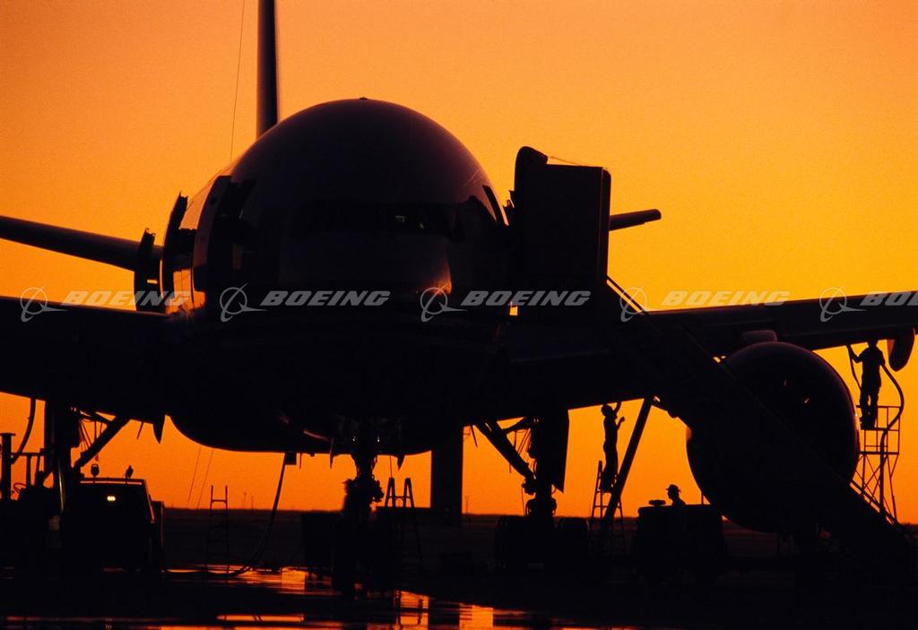 Sunset Silhouette of 777 with Passenger Boarding Stairs