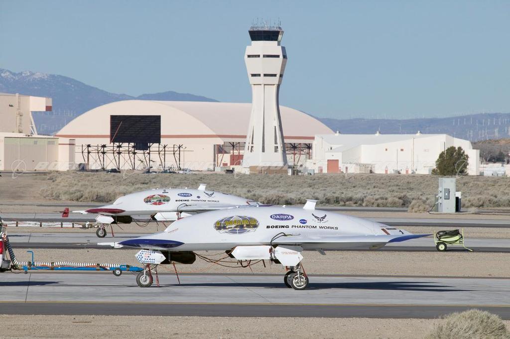 The two Boeing J-UCAS X-45A unmanned aircraft are prepped prior to their first simulated combat mission and 50th flight at NASAs Dryden Flight Research Center.