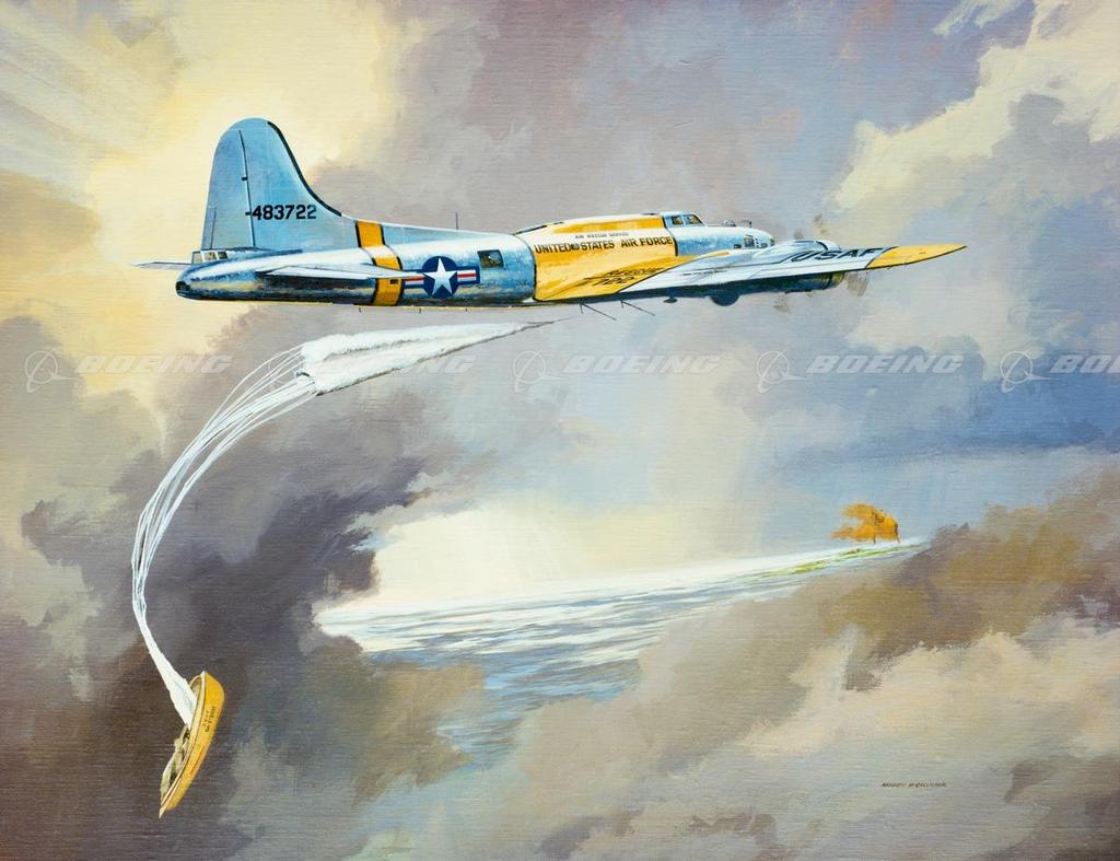 A B-29 crew is rescued near Bermuda by a B-17G "Dumbo" dropping a wooden Higgins A-1 Airborne Lifeboat.