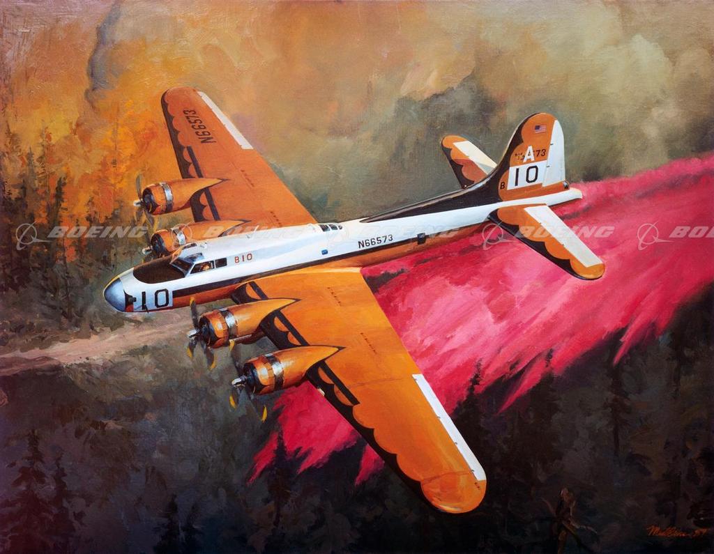 Postwar B-17 conversions included B-17s as trainers, VIP transports, radio-controlled targets for missile tests, as well as for search and rescue, anti-submarine manuevers, and reconnaissance. In this painting by Jay Mullins, pilot Jay LeRoux is commemorated for his efforts to combat the Cayuse Saddle Fire outdside of Missoula, Montana in 1979. LeRoux made three effective drops on the fire in the "Batmobile" when he made a wrong turn and caught the aircraft's wing in the trees and crashed. Both LeRoux and his co-pilot were killed.