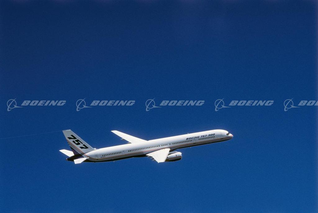 757-300 in Flight with Blue Sky and Snow-Covered Cascade Mountains